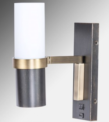 16"H Brushed Brass and Oil Rubbed Bronze Adjustable Wall Sconce, two GU24 sockets, direct wired, dual on/off rocker switch at back plate, one USB port, with Translucent White Acrylic Shade. Recommend two 13 watt CFL bulbs with GU24 base.