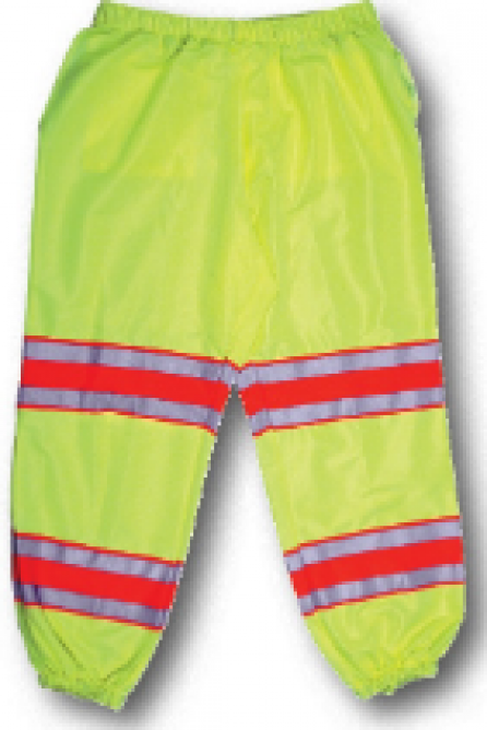 Lime pants with 4" high visibility orange fabric with double 1" silver reflective stripes. 3.65 oz breathable, extra durable 100% knit polyester high visibility lime material. Matching high visibility trim all around. Side pocket slits for easy access to pant pockets. Elastic Waist.