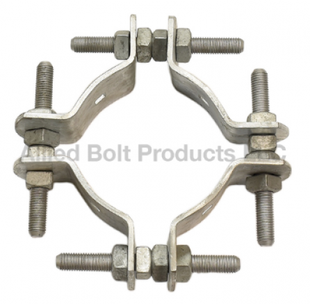 Adjustable Pole Bands provide attachment points for guys and suspension insulators. Each Adjustable Pole Band Assembly contains four 1/4" x 4" stampings, four 3/4" threaded studs, and sixteen 3/4" Regular Square Nuts. Each stamping has a 9/16" square hole. All components are hot dip galvanized to meet ASTM Specification A153.