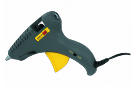 Offers the versatility of high- and low-temperature gluing in one gun. Convenient, one-touch high/low selector switch. Uses standard dual-temperature glue on both settings and hot-melt formulas on high setting. Heats up quickly and bonds within 60 seconds. Fold-out stand for handy storage while in use.