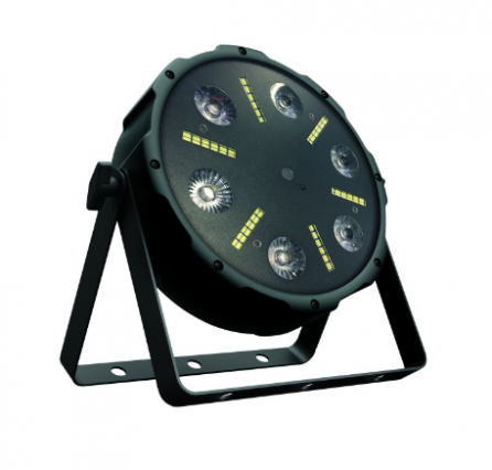 6-9 watt LEDs, 72-SMD and Red/Green Laser Extremely bright and compact multi-effect fixture Each effect can be triggered individually via DMX, Sound activation and/or auto programs