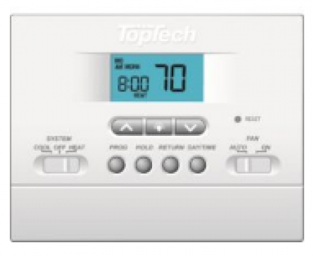 TopTech - The TopTech Programmable Multi-Stage Thermostat is compatibile with low voltage single stage gas, oil or electric heating or cooling systems, including single stage heat pumps. It can also be used on 250mv - 750mv heating-only systems. It features a large display with a blue backlight and mounts to a horizontal box.