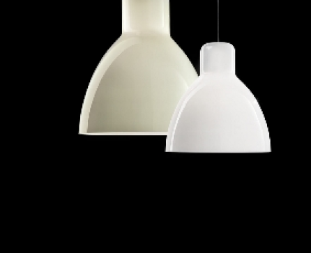 Classic clean-lined design available in : Glossy White, Straw Yellow or Pale Grey hand-blown glass. Metal Canopy in polished chrome.