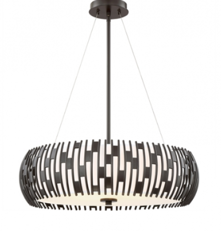 The uniquely designed Brigade pendant is a vision of metal and fabric. The clean lines of the outer metal shade are joined together by rectangular pieces in the same Western Bronze finish. An off-white fabric inner shade is balanced with an etched glass diffuser and coordinating finial.