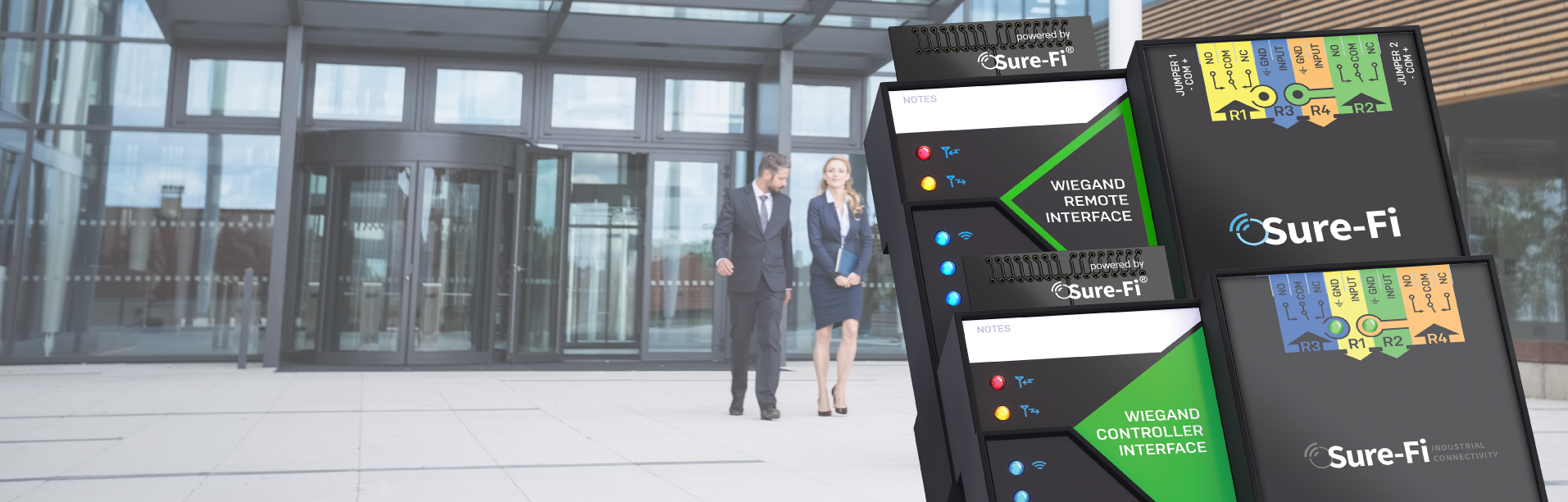 Works with Any Wiegand protocol. 1 Wiegand inputs. 2 relay outputs (Wet or Dry). Request to exit input (REX). Door monitor input (DPS). Battery backup input with battery charger and UPS function. DIN rail mount or direct wall mount. Signal Strength, Transmit & Receive indicators. Test Button for easy range testing. Field configurable and updatable with Sure-Fi App.